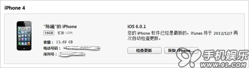 a) 將iOS連接iTunes, 如果官方已推出新版本,iTunes會彈出升級提示,根據提示進行操作即可,也可以手機點擊“檢查更新”檢索最新版本的固件。此功能只能針對未越獄的iOS設備有效,升級完成後系統數據不會丟失。(如果iOS設備之前未在這台PC上進行過同步,則會要求Apple ID授權,否則將抹去所有數據。建議在之前同步過的同一台PC上操作。)