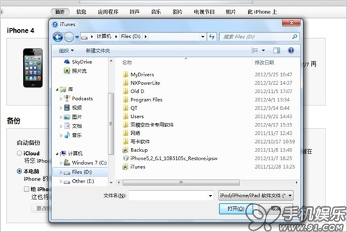 b) 也可以按住PC鍵盤上的“Shift”鍵(OS X系統上是Options鍵),點擊“檢查更新”,在彈出的對話框中選擇之前已下載好設備固件進行更新,更新過程中PC要接入互聯網。如果iOS之前進行過越獄操作,則直接選擇系統恢復。若選擇直接升級會導致iOS設備白蘋果。(如果iOS設備之前未在這台PC上進行過同步,可以通過這種方法升級保留原設備內的數據不丟失。)