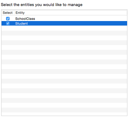 Xocde工具提供了快捷的實體類化功能,還拿我們一開始創建的班級與學生實體來演示,點擊.xcdatamodeld文件,點擊Xcode工具上方導航欄的Editor標簽,選擇Creat NSManagedObject Subclass選項,在彈出的窗口中勾選要類化的實體,如下圖: