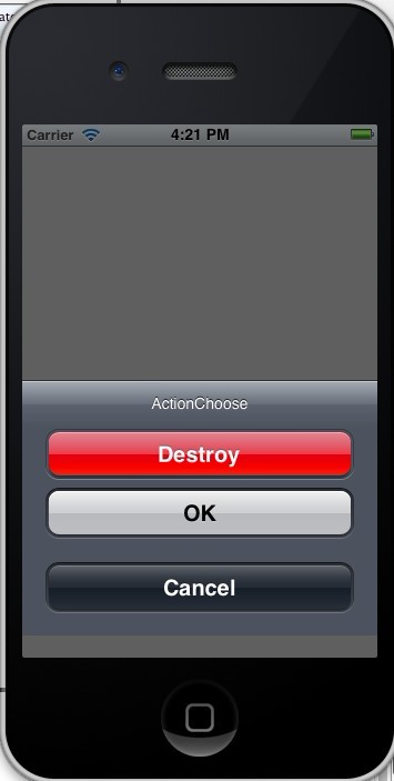 與UIAlertView類似,我們也是在委托方法裡處理按下按鈕後的動作。記得在所委托的類加上UIActionSheetDelegate。
