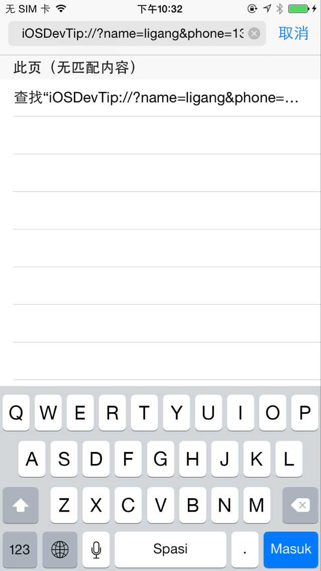我們依然通過Safari來測試,在Safari的地址欄中輸入:iOSDevTip://?name=ligang&phone=13888888888