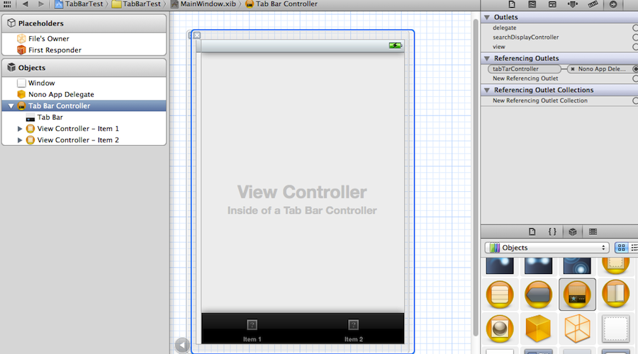 要創建兩個這樣的對象然後將其連接起來。window這時已經有了,還少個UITabBarController。那麼我們從右邊拖個過來咯