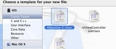 3、創建一個UITableViewCell的子類:選中Custom Cell目錄,依次選擇File — New — New File,在彈出的窗口,左邊選擇Cocoa Touch,右邊選擇Objective-C class: