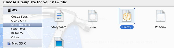 4、創建CustomCell.xib:依次選擇File — New — New File,在彈出的窗口,左邊選擇User Interface,右邊選擇Empty: