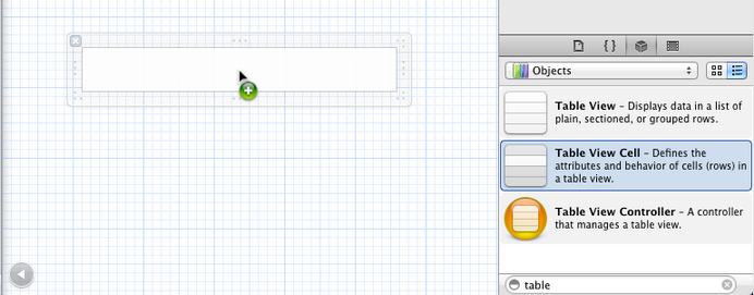 5、打開CustomCell.xib,拖一個Table View Cell控件到面板上: