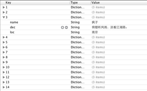 不過在此之前,我們先新建一個plist,用於存儲想要顯示的數據。建立plist文件的方法前面的文章有提到。我們建好一個friendsInfo.plist,往其中添加數據如下: