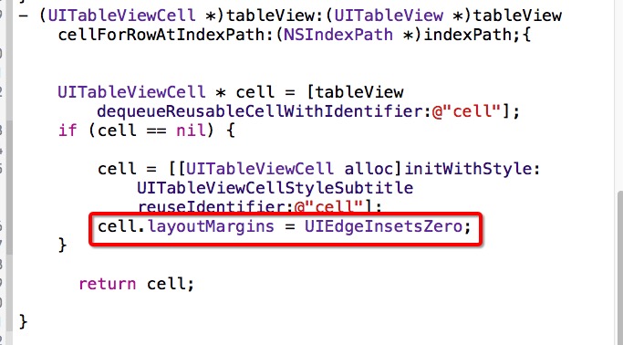 sTableView.separatorInset = UIEdgeInsetsZero; sTableView.layoutMargins = UIEdgeInsetsZero; cell.layoutMargins = UIEdgeInsetsZero;
