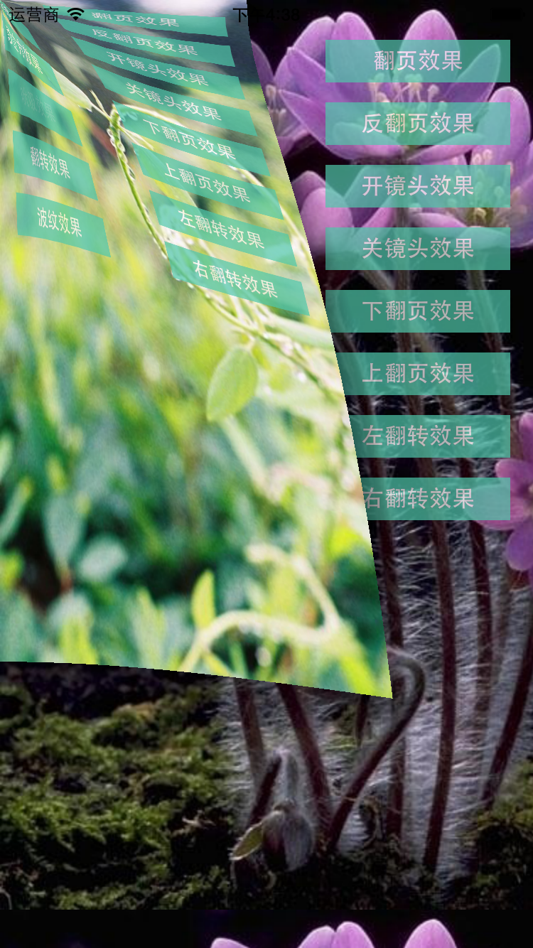 case CurlDown: [self animationWithView:self.view WithAnimationTransition:UIViewAnimationTransitionCurlDown]; break; case CurlUp: [self animationWithView:self.view WithAnimationTransition:UIViewAnimationTransitionCurlUp]; break; case FlipFromLeft: [self animationWithView:self.view WithAnimationTransition:UIViewAnimationTransitionFlipFromLeft]; break; case FlipFromRight: [self animationWithView:self.view WithAnimationTransition:UIViewAnimationTransitionFlipFromRight]; break;