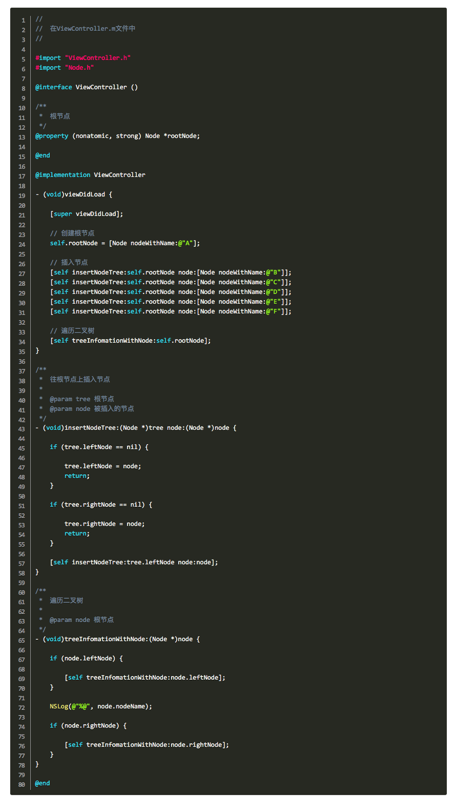 1-2、然後我們在ViewController.m去使用這個Node節點類來實現上面的二叉樹