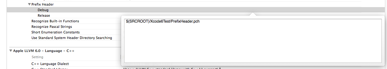 (2)在Prefix Header下面的Debug和Release下添加$(SRCROOT)/工程名/pch文件,入下圖