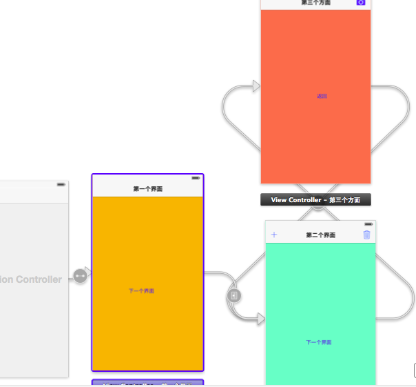 在storyboard中,默認的控制器是View Controller,而我們需要的是導航控制器,那麼就把系統的給刪掉,拖一個導航控制器進來,導航控制器中默認的第一個子控制器是一個tableview controller,這裡不需要,把它刪掉,重新拖三個View Controller到界面上進行連線,簡單的設置就可以了。