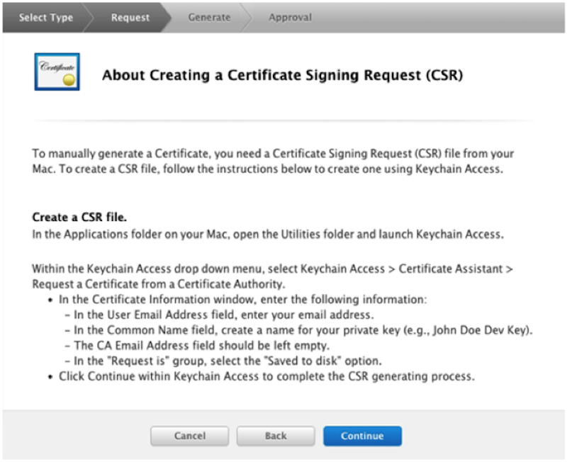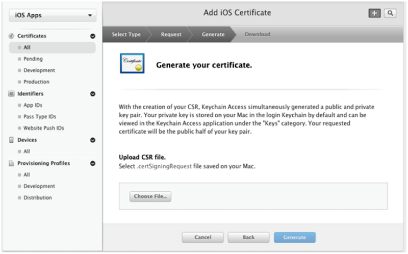 生成證書後,返回到 “About Creating a Certificate Signing Request (CSR)” 的界面,點擊 continue,然後在 “Choose File” 選擇生成的CSR文件,最後點擊 Generate,生成證書。如下圖: