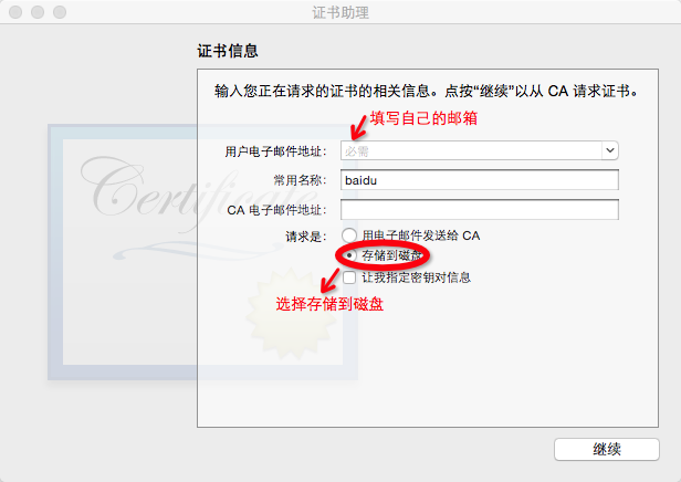 到了這裡,需要停下制作 CSR 文件,制作過程比較簡單,下面是制作的過程。打開 Mac 系統軟件'鑰匙串訪問',選擇 '證書助理' 及 '從證書頒發機構請求證書',制作 CSR 文件,如下圖: