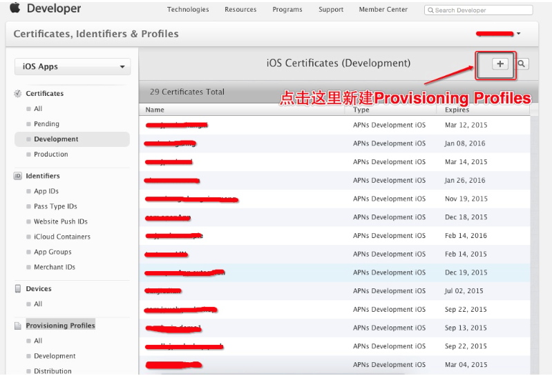 首先登陸 iOS Dev Center ,然後進入 Member Center,然後選擇 Certificates,Identifiers & profiles,如下圖: