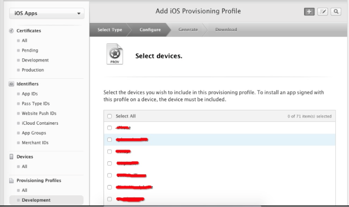 選擇創建profile的appid和開發者證書,並選擇設備,最後生成profile