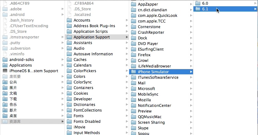 選擇Application Support-iPhone Simulator-選擇模擬器版本,即可看到各個應用的沙盒目錄。