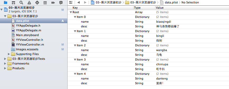 2.使用plist:讓數據的操作更加靈活,把數據弄到外面去,解除耦合性,讓耦合性不要太強。實際上是一個xml,是蘋果定義的一種特殊格式的xml。