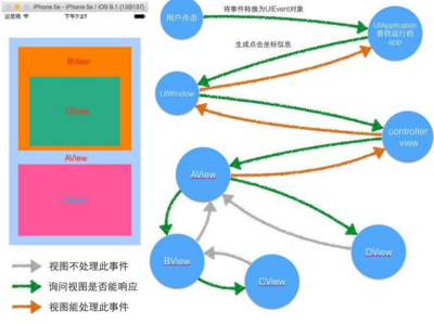 棧頂的響應者作為最優先處理事件的對象,假設AView不處理事件,那麼出棧,移交給UIView,以此下去,直到事件得到了處理或者到達AppDelegate後依舊未響應,事件被摒棄為止。通過這個機制我們也可以看到controller是響應者棧中的例外,即便沒有pointInSide: withEvent:的方法返回可響應,controller依舊能夠入棧成為UIView的下一個響應者。