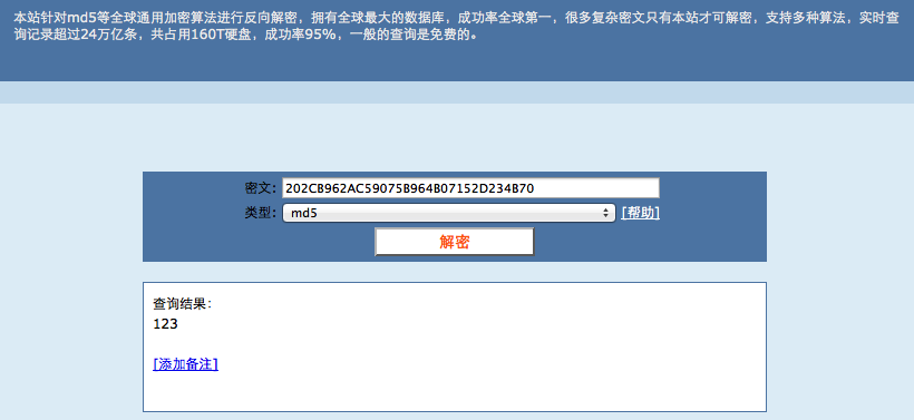 (1)直接使用MD5加密(去MD5解密網站即可破解)