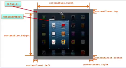 (1)UIScrollView的frame與contentsize屬性的區分:UIScrollView的frame指的是這個scrollview的可視范圍(可看見的區域),contentsize是其滾動范圍。