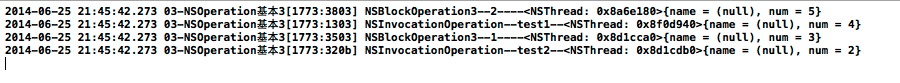 注意:系統自動將NSOperationqueue中的NSOperation對象取出,將其封裝的操作放到一條新的線程中執行。上面的代碼示例中,一共有四個任務,operation1和operation2分別有一個任務,operation3有兩個任務。一共四個任務,開啟了四條線程。通過任務執行的時間全部都是273可以看出,這些任務是並行執行的。