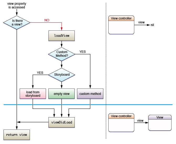 1.首先看loadView和viewDidLoad的區別,兩者都是用來初始化試圖控制器中的視圖如何顯示的。還是先看官方API解釋:If you create your views manually, you must override this method and use it to create your views.If you use Interface Builder to create your views and initialize the view controller that is,you initialize the view using the initWithNibName:bundle: method,set the nibName and nibBundle properties directly, or create both your views and view controller in Interface Builder—then you must not override this method.(如果你手動創建一個視圖控制器,你必須重載這個方法,去使用他創建你的視圖。如果你使用Interface builder創建和初始化的視圖控制器,你就不必重載此方法)。所以當你手動創建一個視圖控制器的時候一定要注意重載loadView,否則你的視圖將不回顯示你增加的任何字視圖。