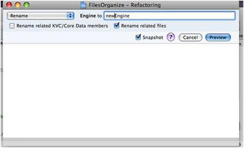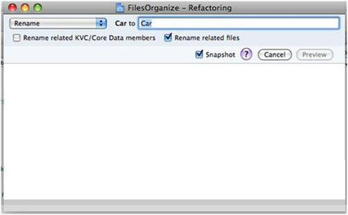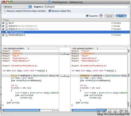 按下 preview按鈕,界面如下所見,Xcode自動給處了我們分析報告,有什麼文件將被修改,每個文件有幾處會被修改等信息。從下面圖可以看到,類名以及類的文件名都被修改了。