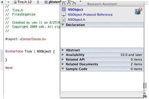 切換到文件Tire.h中,研究助手的浮動窗口就顯示有關NSObject的信息: