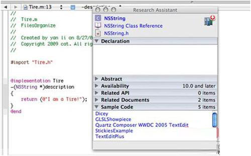 如下圖所示:在Tire.m文件中,當光標在NSString類上時,研究助手浮動窗口所顯示的信息: