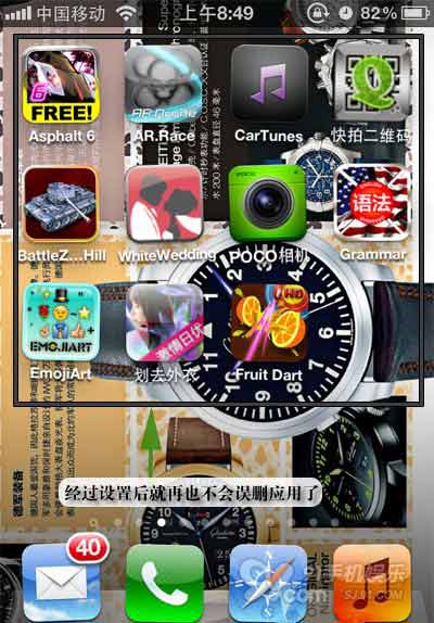 第五步:返回主界面後長按任一圖標,界面的圖標知識晃動,那個刪除程序的叉叉不見了,這樣就可以防止小孩或者本人不小心把自己喜愛的應用程序刪除了。如果想整理桌面上的圖標並有意刪除不想用的程序時,只要把【刪除應用程序】往右拉動即可。