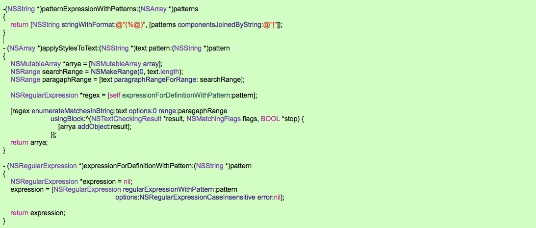 傳入字符串text,和需要高亮的字串patterns , 正則表達式就是字串的 "|" 集合, 根據正則表達式進行字串的大小寫不敏感匹配, 然後枚舉生成的NSTextCheckingResult,保存在數組中,接下來就可以對label字體進行設置了