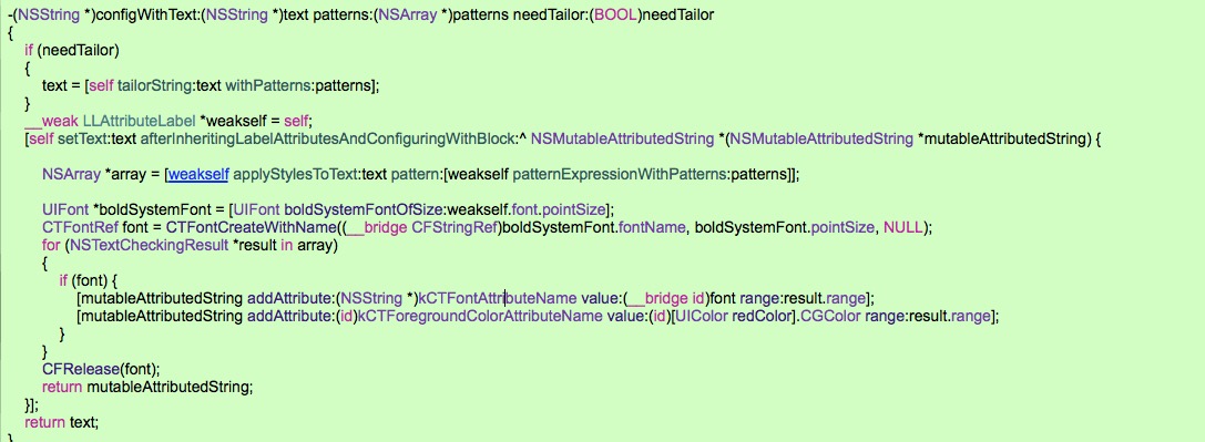 這裡用的是TTTAttribute的setText:afterInheritingLabelAttributesAndConfiguringWithBlock:方法, 在代碼塊裡面遍歷所有的NSTextCheckingResult對象,對其中的NSRange進行顏色字體的設置就完成了想要的效果