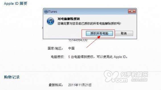 ⒉)再後在上圖的操作界面中中部,我們可以看到有“解除全部授權”入口,通過這裡就可以取消iTunes授權,如下圖: