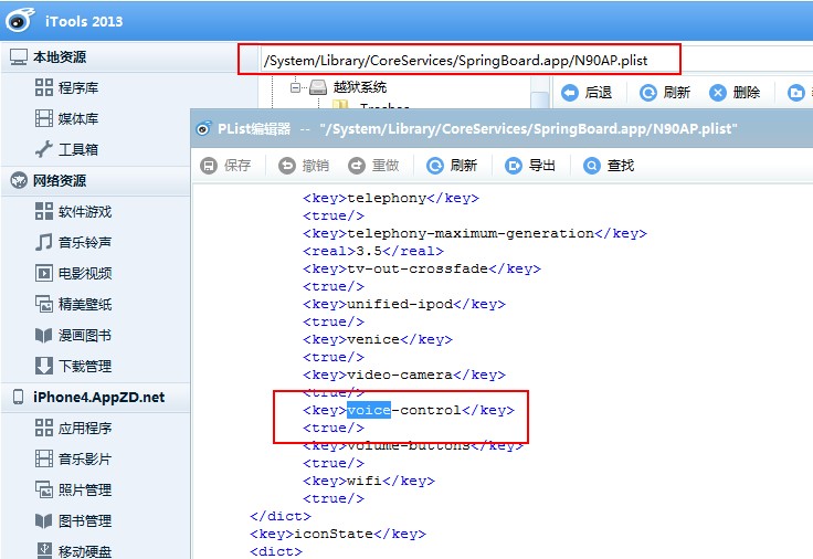 修改/System/Library/CoreServices/SpringBoard.app/N94AP.plist拉到電腦桌面用寫字板打開,然後找到voice-control這項,把ture改成false