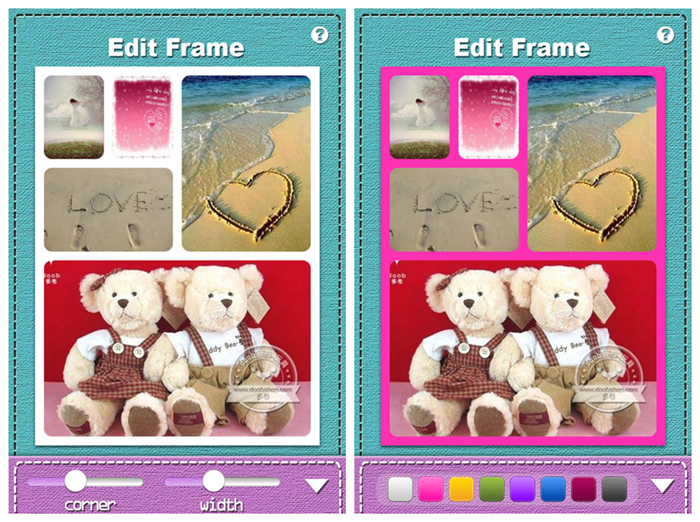 當你調整好導入的圖片後點擊”Border”可以對邊框進行圓角和寬度調整,適當的添加一點圓角能讓拼圖效果更好,稜角分明的邊框看著總是有點不舒服吧。在“Color”中你可以給拼圖添加背景顏色,一共有8種顏色可供選擇,不過對於創意比較足的童鞋來說8種顏色感覺還是有點不夠啊,最低限度,增加邊框花紋和背景效果的話應該會好一些。