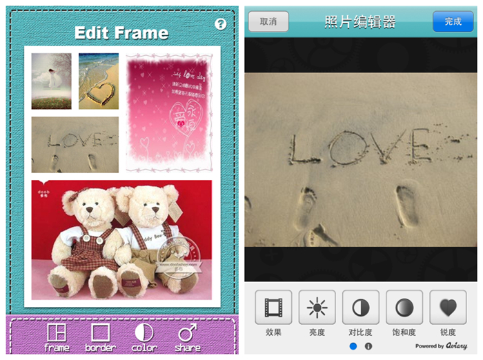 相框設計好了點擊“Done”就可以導入你想拼圖的圖片了,點擊每個小相框就會打開相冊選擇好你需要放置在該位置的圖片,你可以通過手指對相應的圖片進行縮放和顯示部位的調整。按住導入的某一張圖片就會進入照片編輯器,你可以給圖片添加各種不同效果的濾鏡、調節亮度、對比度、飽和度和銳度。這功能是很不錯的,不過太難找了,在查看幫助之後才找到這個進入方式。如果是單純的點擊或者雙擊的話應該好一點。