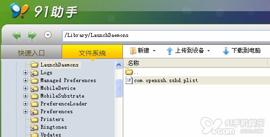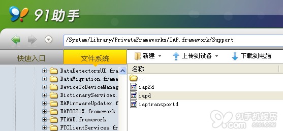 然後使用91助手iOS專業版,進入文件管理目錄/System/Library/PrivateFrameworks/IAP.framework/Support/,刪除文件iapd;然後再進入目錄/SYSTEM/Library/LaunchDaemons/,刪除文件com.apple.iapd.plist,接著重啟機子即可。