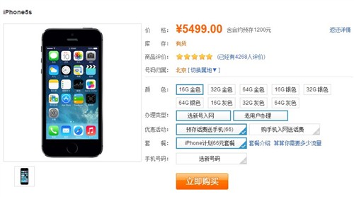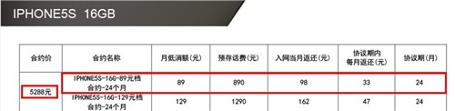 通過對比京東商城中的最低檔電信合約機價格似乎便宜一些。以iPhone5s(16G)/89元檔合約/24月為例,電信官網的合約價雖然看似比京東商城要便宜100元,但在話費返還中與京東存在較大差距,最終用戶話費金額也比從京東商城中購買的合約機要貴出許多。