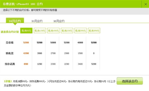 同樣以iPhone5s(16G)合約機為例,中國電信為用戶提供了24/30/36月三種合約套餐計劃,其中在24個月的合約計劃裡最低月消費為89 元,若你想進行0元購機那麼你可以在“24月合約/月租389元”、“30月合約/月租329元”或者是“36月合約/月租289元”中任選其一。
