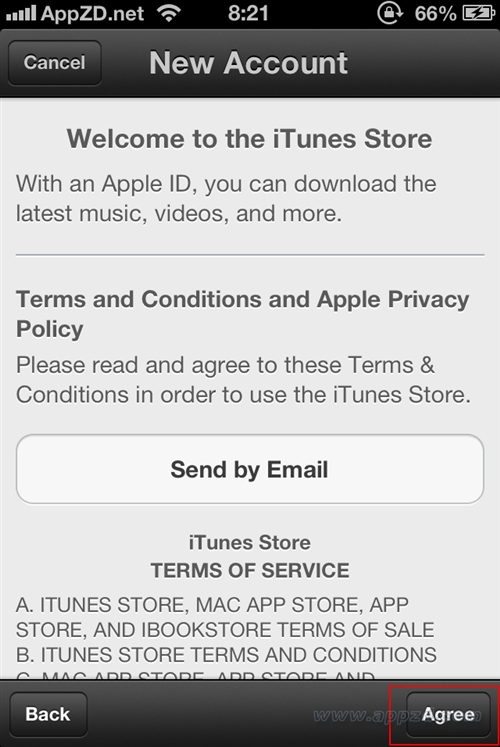 5.接著是閱讀並同意 iTunes Store 條款與條件,點擊頁面底部的Agree(同意)