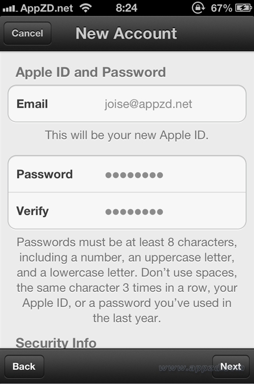6.接著來到個人信息頁面,在這裡輸入電子郵件地址、密碼、安全提示問題、生日等,輸入之後點擊Next(下一步)