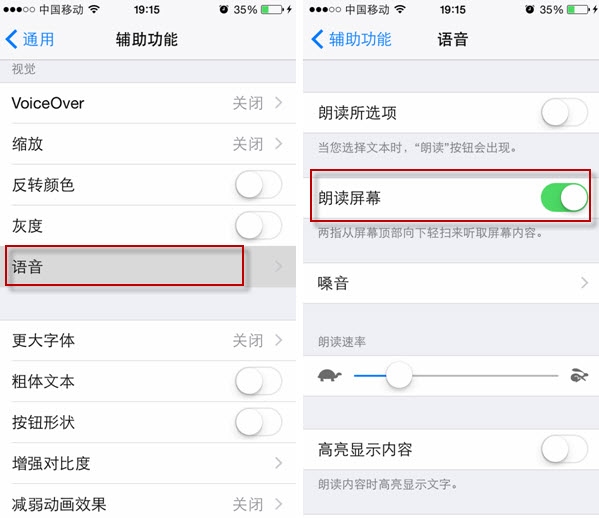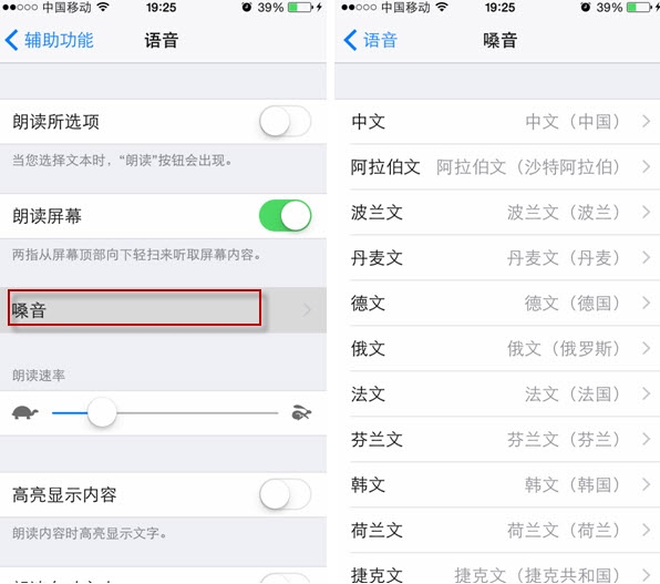 提示1:iOS8屏幕誦讀功能支持自定義語言。也就是說中文、香港、台灣等不少的地方方言都可以做為備選項。需要設置時在“語音”設置界面下單擊“噪音”一項進入再行選擇即可。需要注意的是,除了默認的以外,其他的語言選擇後都需要聯網下載語音包。