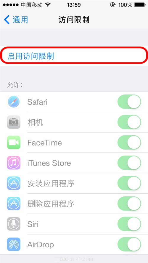 第4步:進入“訪問限制”,此時我們會看到主列表中有許多應用程序是灰色的不可用狀態,要想修改,首先點擊上方的“啟用訪問限制”按鈕;