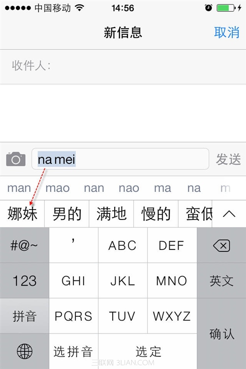 其次,iOS 7內置輸入法還具有更有趣的聯想功能。比如,你的通訊錄中有一個聯系人叫“娜妹”,那麼當你輸入namei這樣的拼音時,首先匹配的一定就是通訊錄中的這個“娜妹”聯系人。