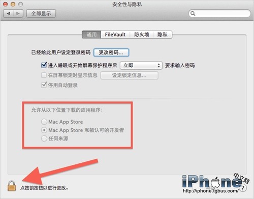 在安全與隱私設置面板裡選擇 “通用” 標簽(其實默認就應該到那)。看到上面截圖裡小編用拿紅框標出的幾個選項了吧,把允下載的應用程序從默認的 “Mac App Store 和被認可的開發者” 改選為 “任何來源” 就行了。
