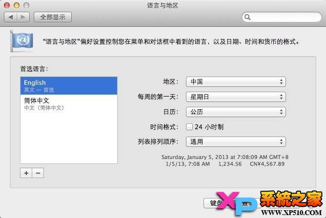Mac版使用請在 系統偏好設置-語言與地區-首選語言-選中English不放-將其上移拖動到最上即可。