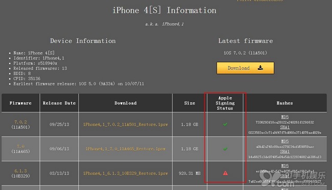 如果你只是要查看自己設備的iOS驗證情況,可以訪問http://www.icj.me/ios/設備版本號,如http://www.icj.me/ios/iPhone4,1就是iPhone 4S的iOS版本驗證情況。