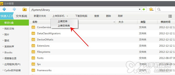 打開PC端91助手,進入文件管理目錄/System/Library。依次點擊按鈕【上傳到設備】->【上傳目錄】,然後將之前備份的文件夾Fonts上傳到設備上去即可。