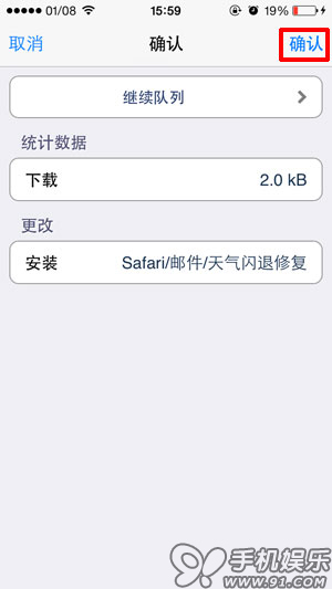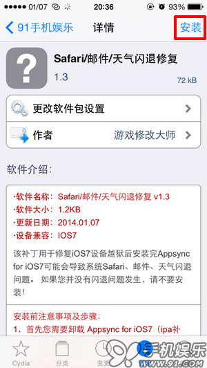 點擊新添加源apt.91.com/7/,進入如下界面,再點擊【Safari/郵件/天氣閃退修復】,再點擊右上角【安裝】—【確認】