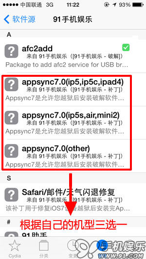 解決方法:進入Cydia的【變更】選項中,點擊左上角的【刷新】按鈕試試,如果還是不出現新的Appsync7.0補丁,請先刪除91補丁源,然後再重新添加apt.91.com/7/,就可以在源裡找到Appsync7.0補丁了。注意源裡會有三個Appsync7.0補丁,請根據自己的機型選擇一個即可。